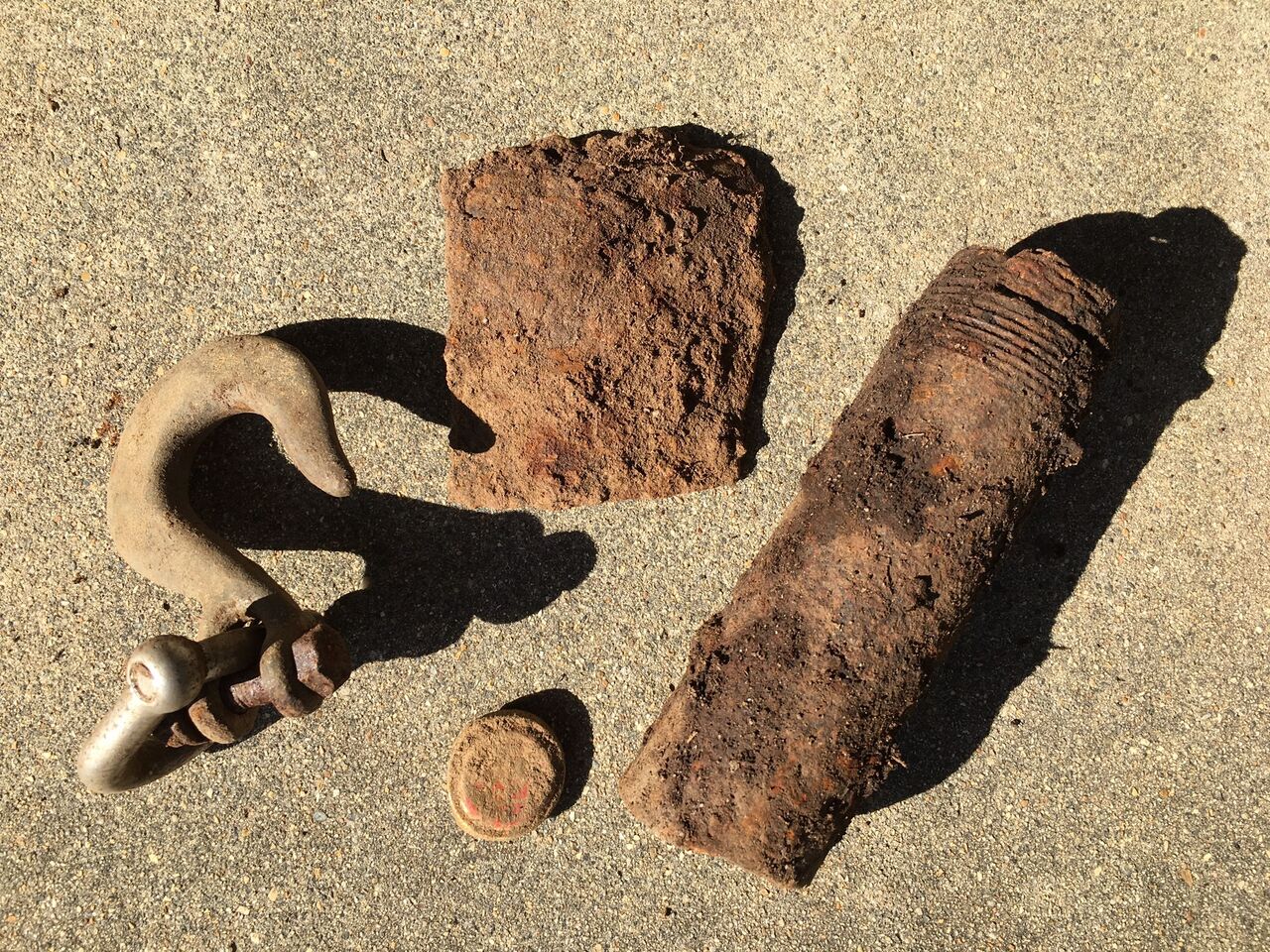 鉄パイプの部品ようなものと、クレーンのフックのようなものは、作業で使ってそのまま忘れられたのでしょう。