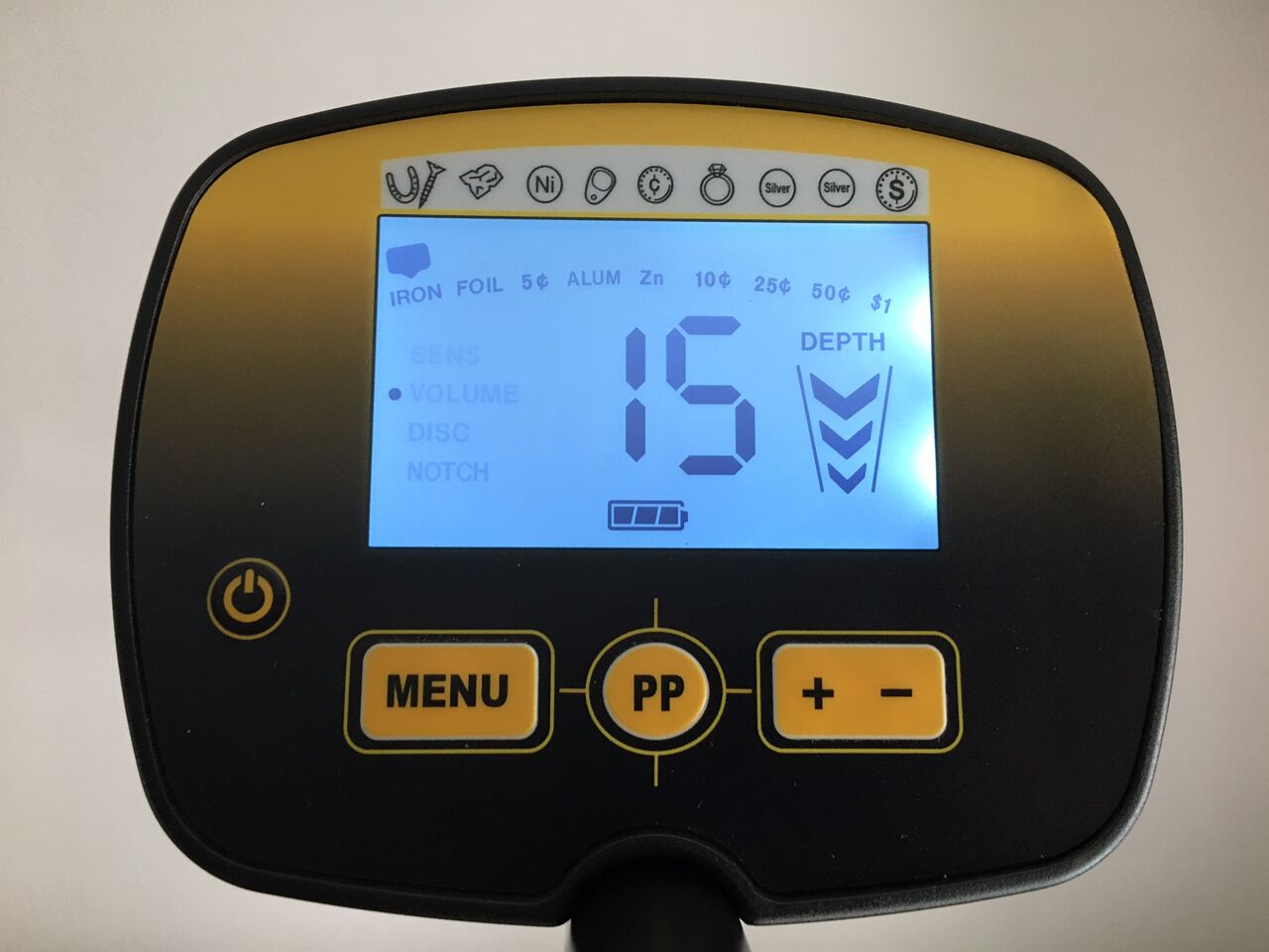 「ディスク」は不要な金属をあらかじめ探知の対象から除外します。液晶画面の上部に左から「IRON(鉄)」「FOIL(アルミ箔)」「5セント硬貨」「ALUM(アルミニウム)」「Zn(亜鉛)」「10セント硬貨」「25セント硬貨」「50セント硬貨」「1ドル硬貨」の表示がありますが、+ボタンを押して左から順番に除外対象を広げ、「Zn」まで除外することができます。