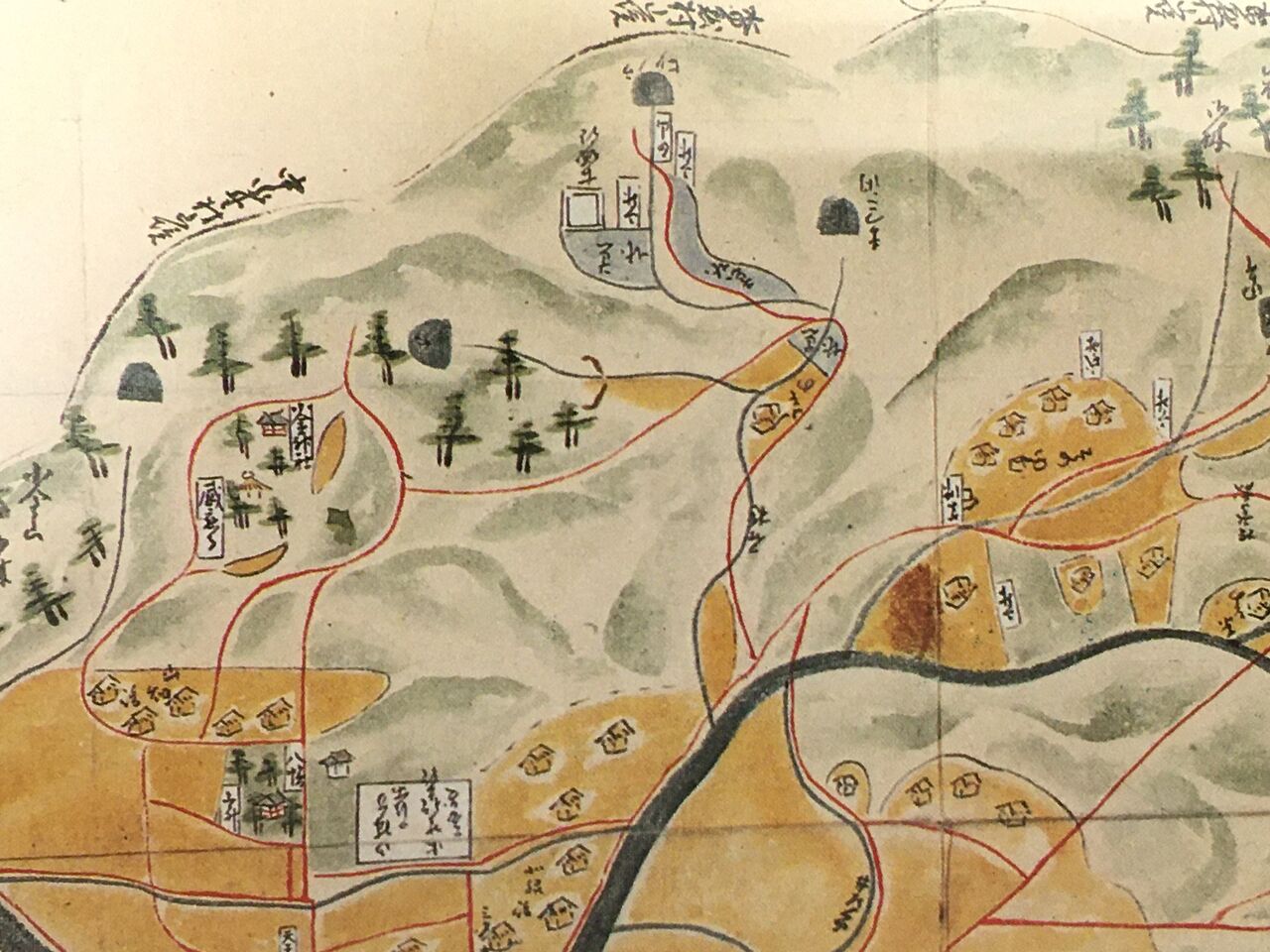 寛政4年の春日井郡上水野村絵図。中央上に古城跡(一色山城址)が見える